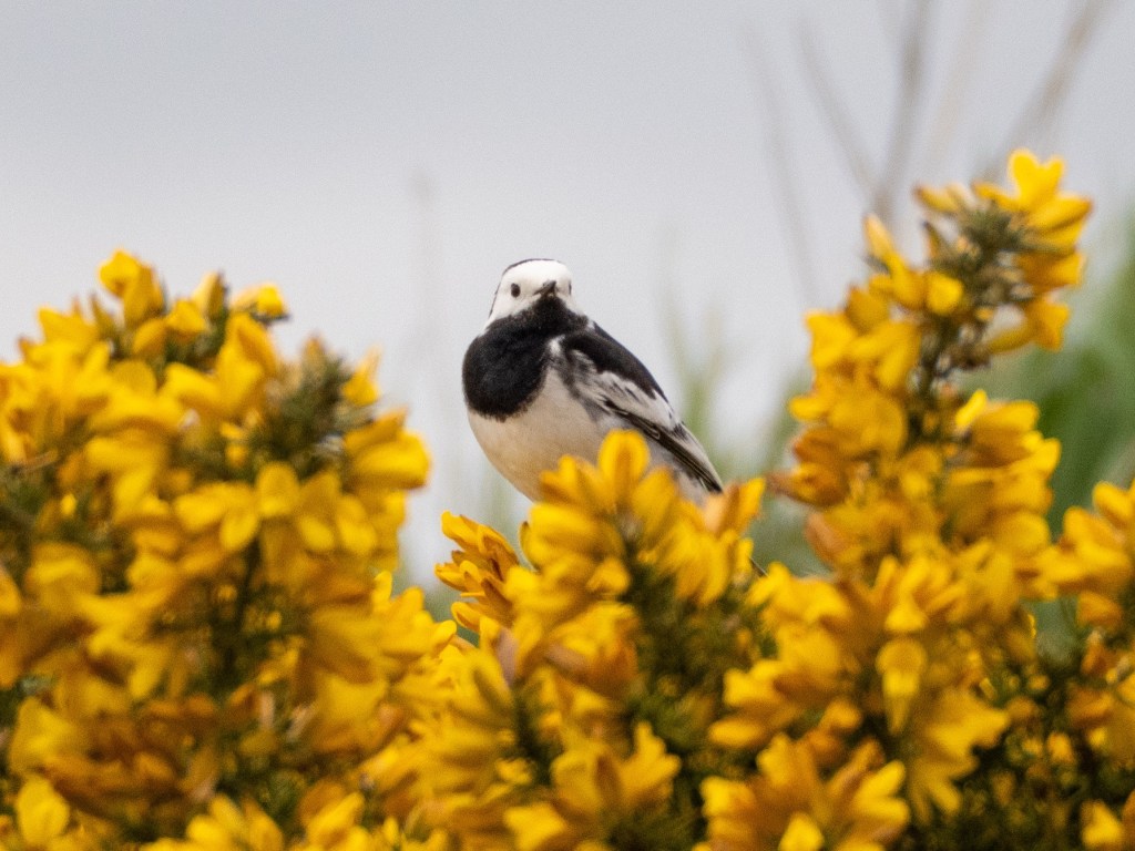 We headed back through the golf course towards the beach and the gorse was in full flower, filling the air with the scent of warm coconut. I spied this white wagtail sitting in the flowers, isn’t he lovely?