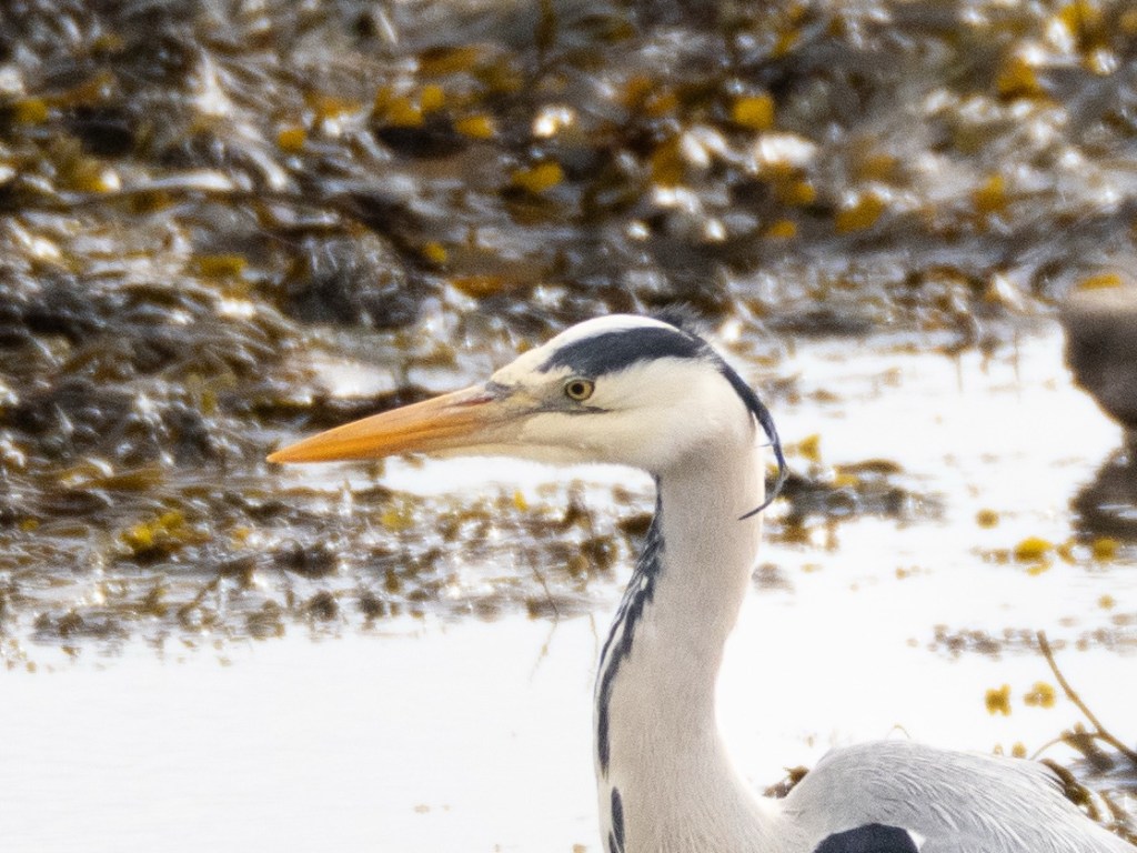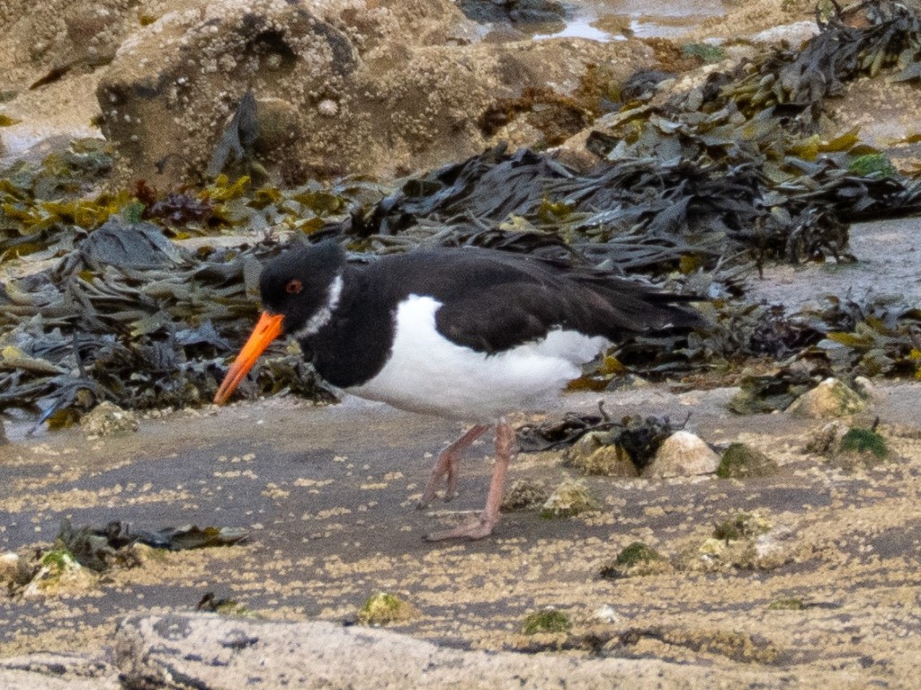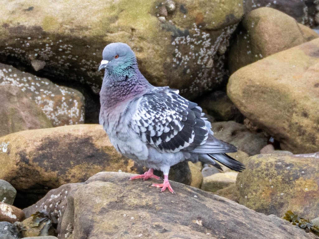 Below the harbour walls, the exposed rocks were playing host to a number of larger birds foraging in the rock pools. I spotted Rock Doves, black headed gulls and oystercatchers. They were all being bullied by the much larger black backed gulls, who were even driving off the herons.