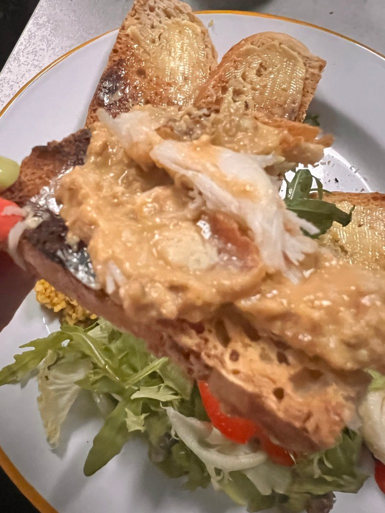 We had the dressed crab served with salad and homemade bread (care of the hubbys secret no-knead recipe). If I can winkle it out of him, I will share it here.