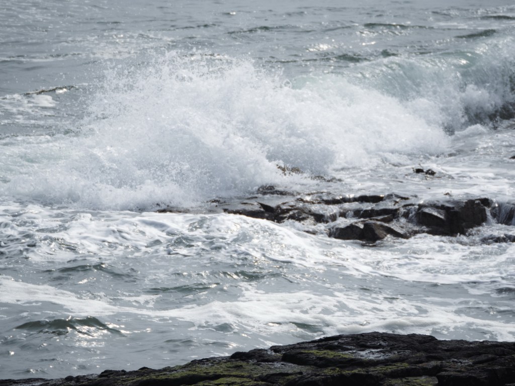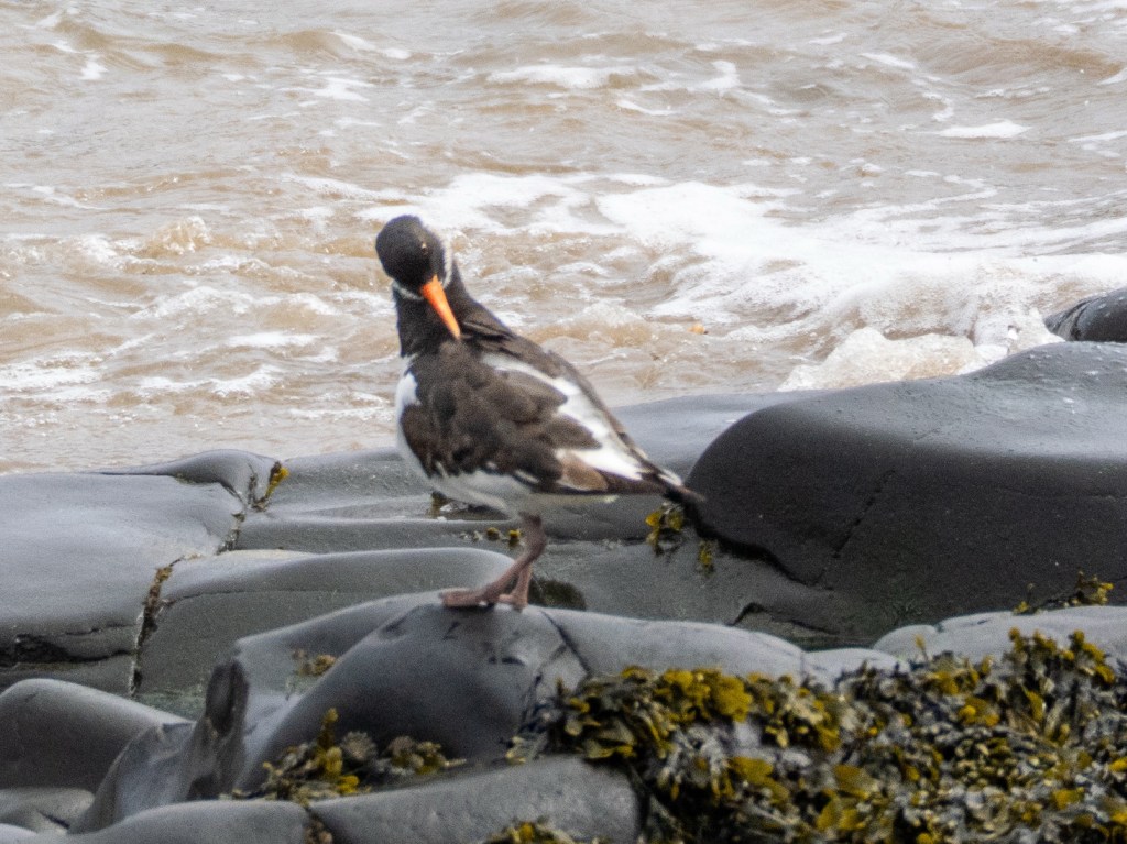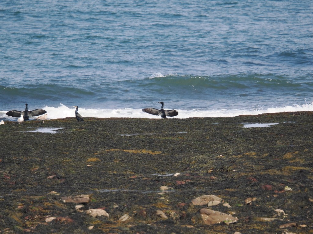On Sunday afternoon, I took Pepper for a wander up the beach, taking my long lens just in case the dolphins showed up.. no luck again, but I was fortunate to see some nice shore birds. Far out on the rocks where a group of cormorants drying their wings. However they weee facing into the spray; is that the bird version of pissing in the wind?