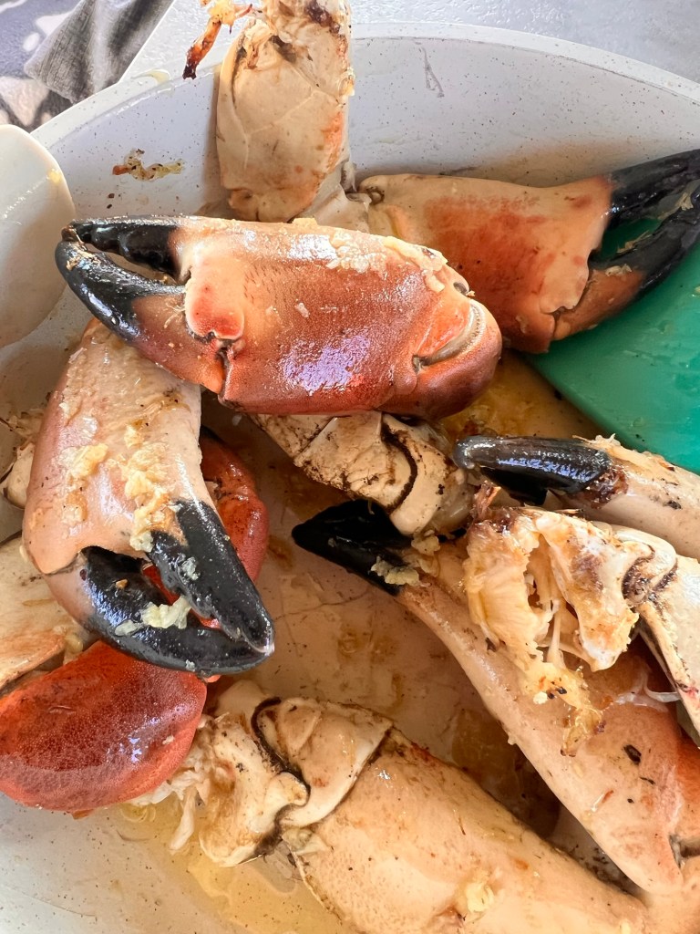 Back at the van, Mark was firing up the BBQ for dinner. We had home made burgers and the crab claws from yesterday’s shopping trip; tossed in garlic butter. Unfortunately, too late we discovered we had forgotten the seafood kit we bought years ago, so Mark resorted to hitting them with the mallet we use for the windbreak. Nevertheless, they were wonderful.