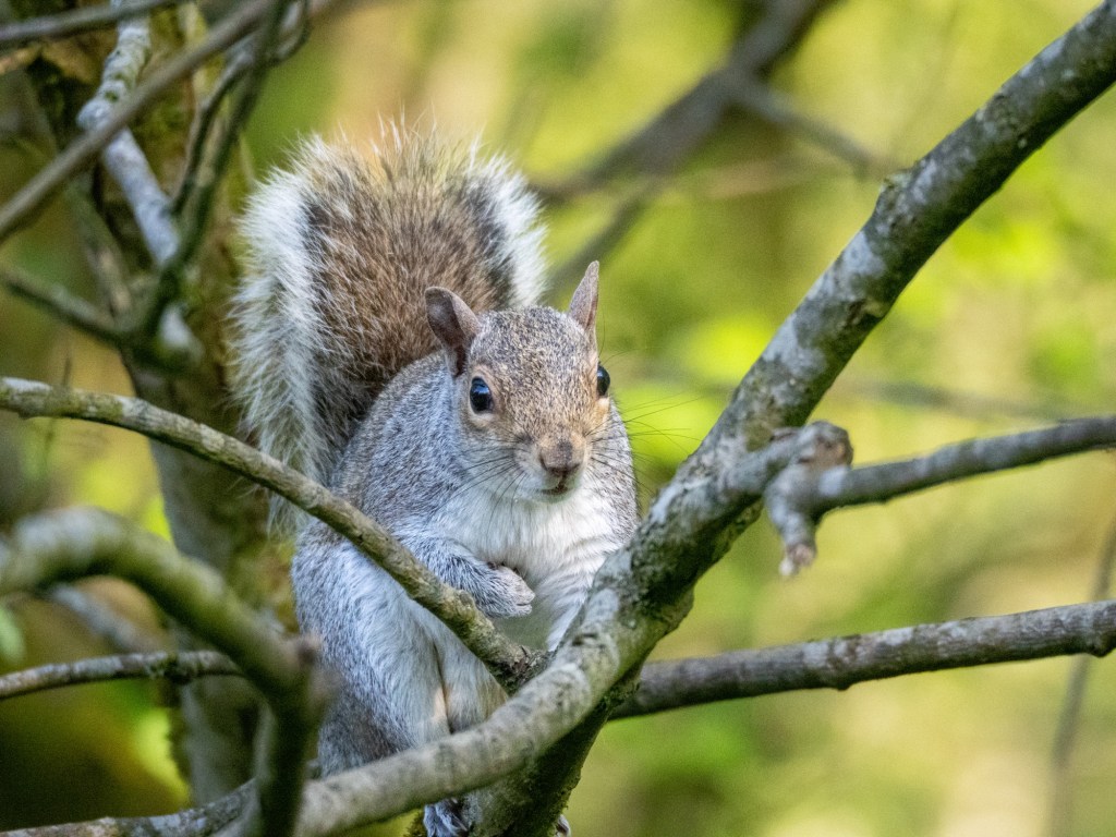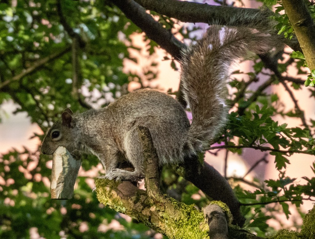 Around the textile museum car park, there was much activity from the grey squirrels. One of them was teasing Pepper, before scurrying off up the trees with some kind of treasure in its mouth. It was clearly a very desirable prize as it was fiercely pursued by a rival squirrel who also wanted the treasure. When I zoomed in later, it appeared to be a block of wood; obviously a precious commodity in squirrel terms!