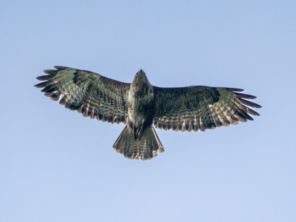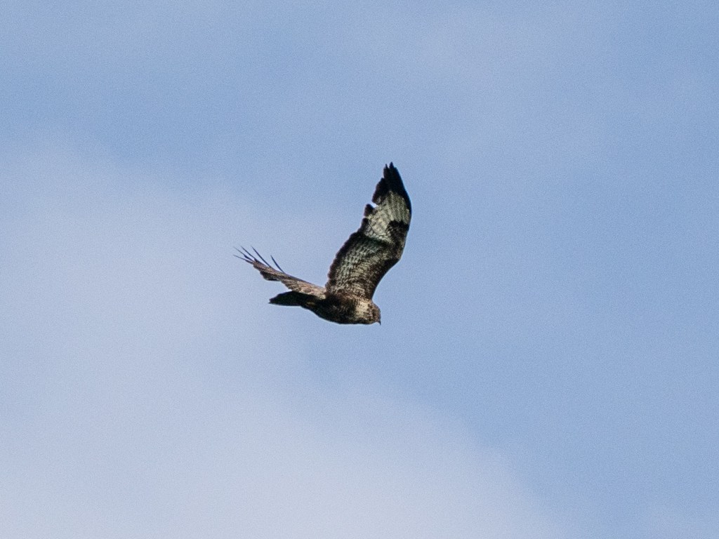 I’ve seen multiple buzzards over the past week (or the same pair several times!). I suspect I have located their nest, so have my camera ready when I’m near and have had a few opportunities to see them. On Thursday one stalked me, hunting low over the path, allowing me time to get some good, clear shots again with the smaller lens.
