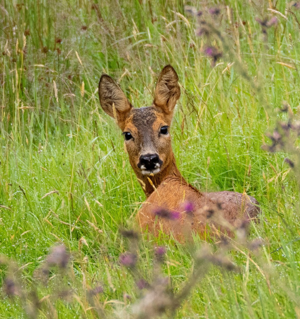 The roe deer calves appear to have now been weaned; Mama has been absent from the birthing area for several days, but the calves have remained. I caught This young doe sleeping in the grass; isn’t she beautiful?