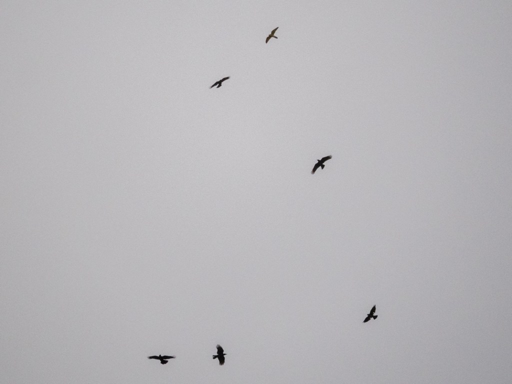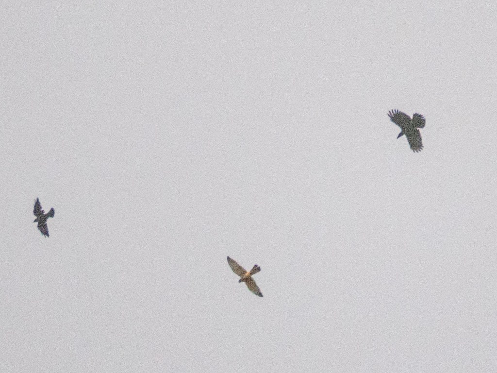 The ongoing crow vs peregrine aerial battle continues this morning; it’s been going on for weeks. I’m not sure the crows will ever catch the peregrine, but they were gamely attempting to see it off.
