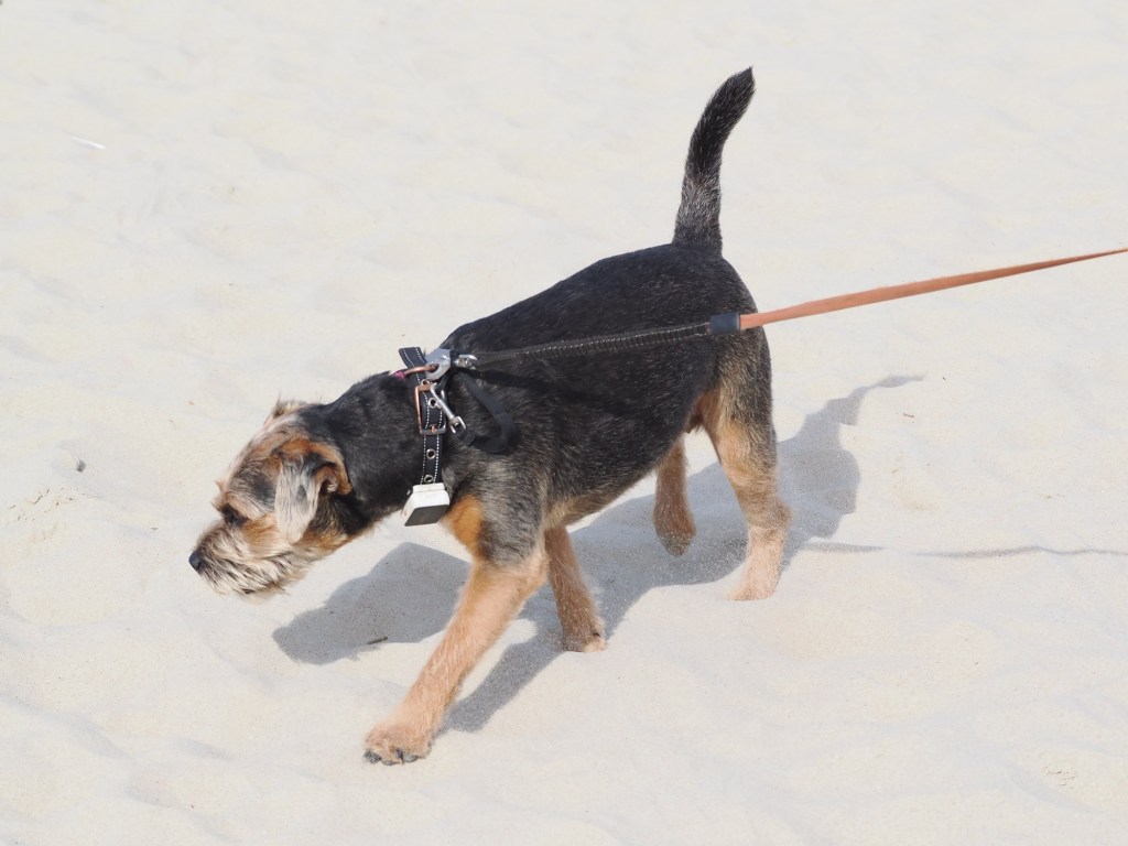 The fine white sand was glorious underfoot, and though it was late autumn, the sun was still warm. Pepper was very content to find a shady patch beside a beach bar for a bit of “shade-bathing.”