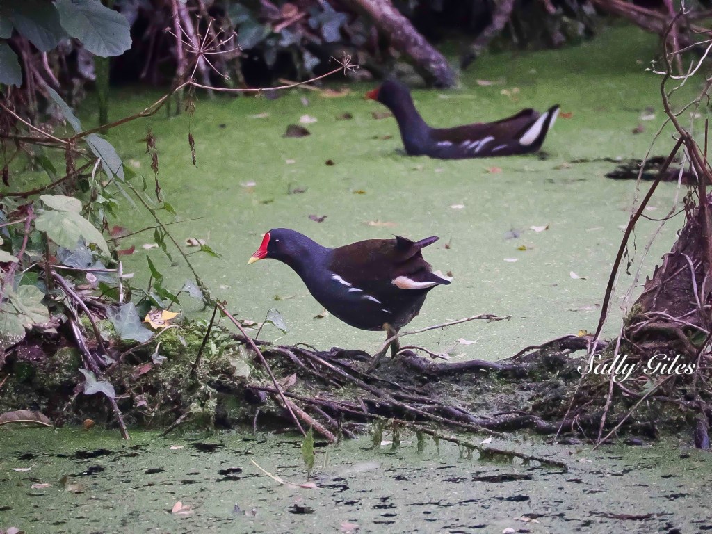 Closer to the visitor centre, a moorhen waded through water greened with algae, its crimson bill vivid against the muted world. Its long legs stirred lazy ripples as it searched for lunch — unhurried, unconcerned by the bluster above.