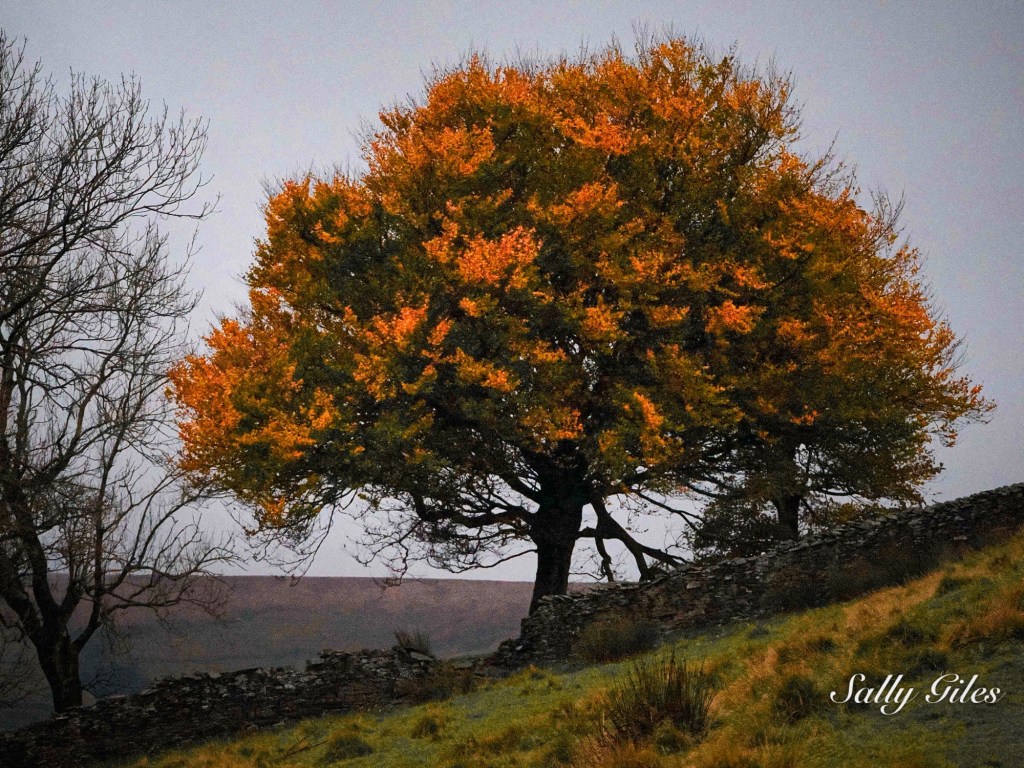 The storms of last weekend have stripped most of the trees bare, carpeting the ground in a mosaic of red, orange, and yellow. Yet my favourite tree stands proud, wearing her golden crown. As the sun rose this morning, she caught the first light and blazed like fire, her leaves turning from gold to a deep, glowing red.