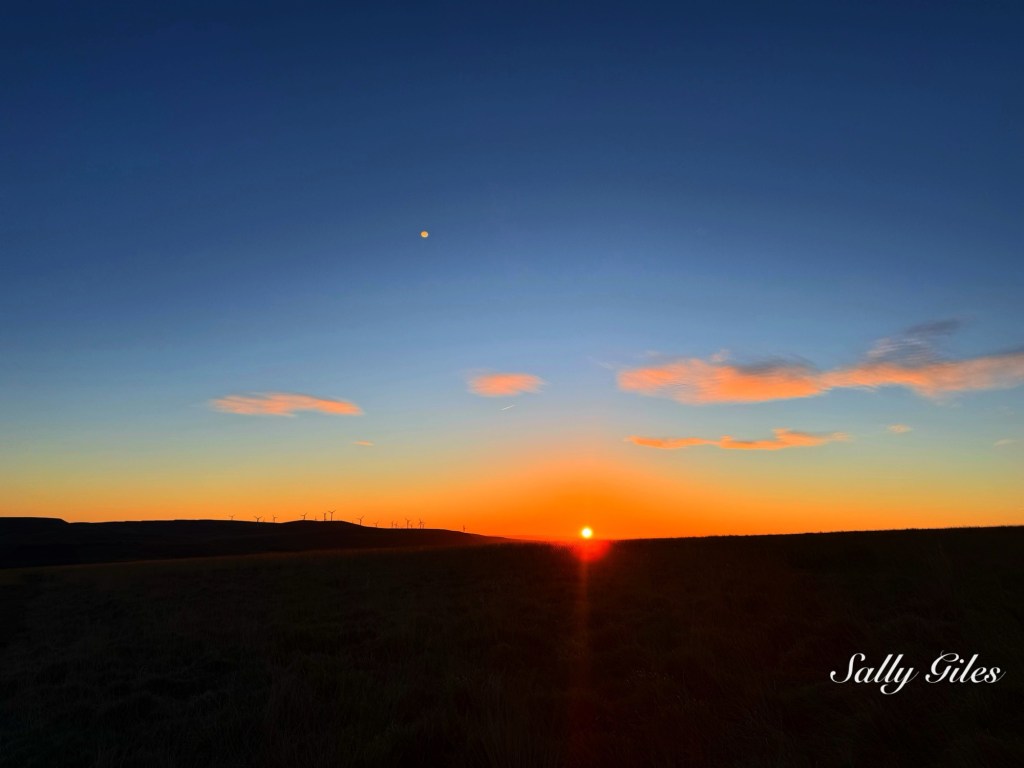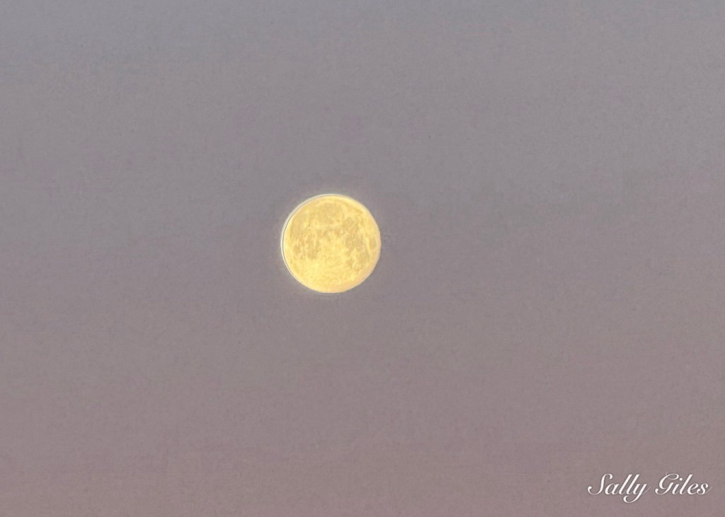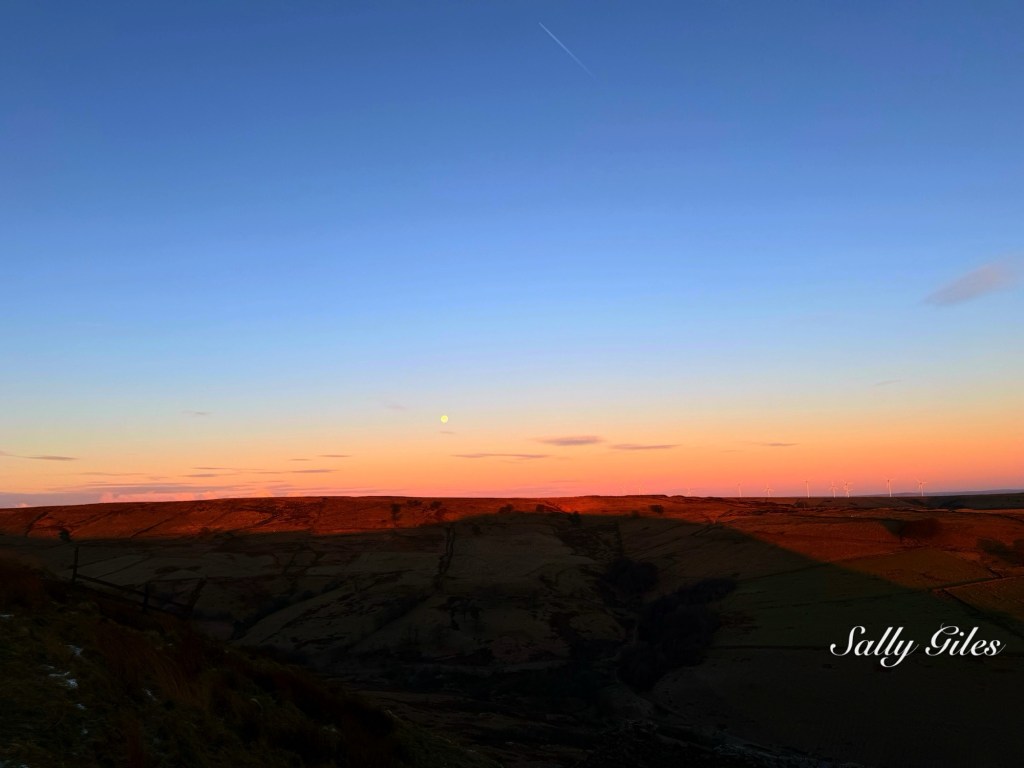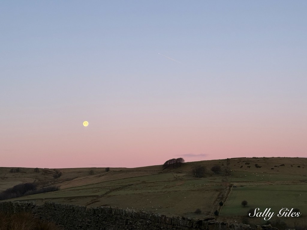 Layered appropriately, we stepped out into the freezing air. Above Musbury Heights, the Wolf Moon still lingered — a January full moon traditionally named for the long winter nights when wolves were once heard howling beyond villages. This one was also a Supermoon, sitting closer to the Earth than usual and appearing larger and brighter, its pale light hanging low in a mauve-tinted sky as we began our climb up the Tor path, eager to catch the sunrise.