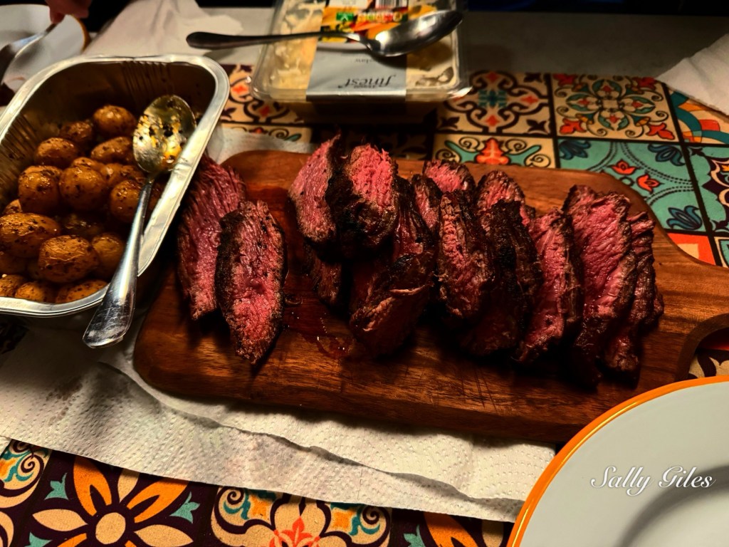 Mark, undeterred by the increasingly enthusiastic wind and rain, took charge of proceedings and produced a perfectly cooked bavette of beef. Served with roasted potatoes, fresh salad, and a generous selection of wine, it set the tone for the weekend. Chocolate treats followed, along with a few warming nips of whisky, and we eventually retired — a little later than planned, a little unsteady on our feet, and entirely content.